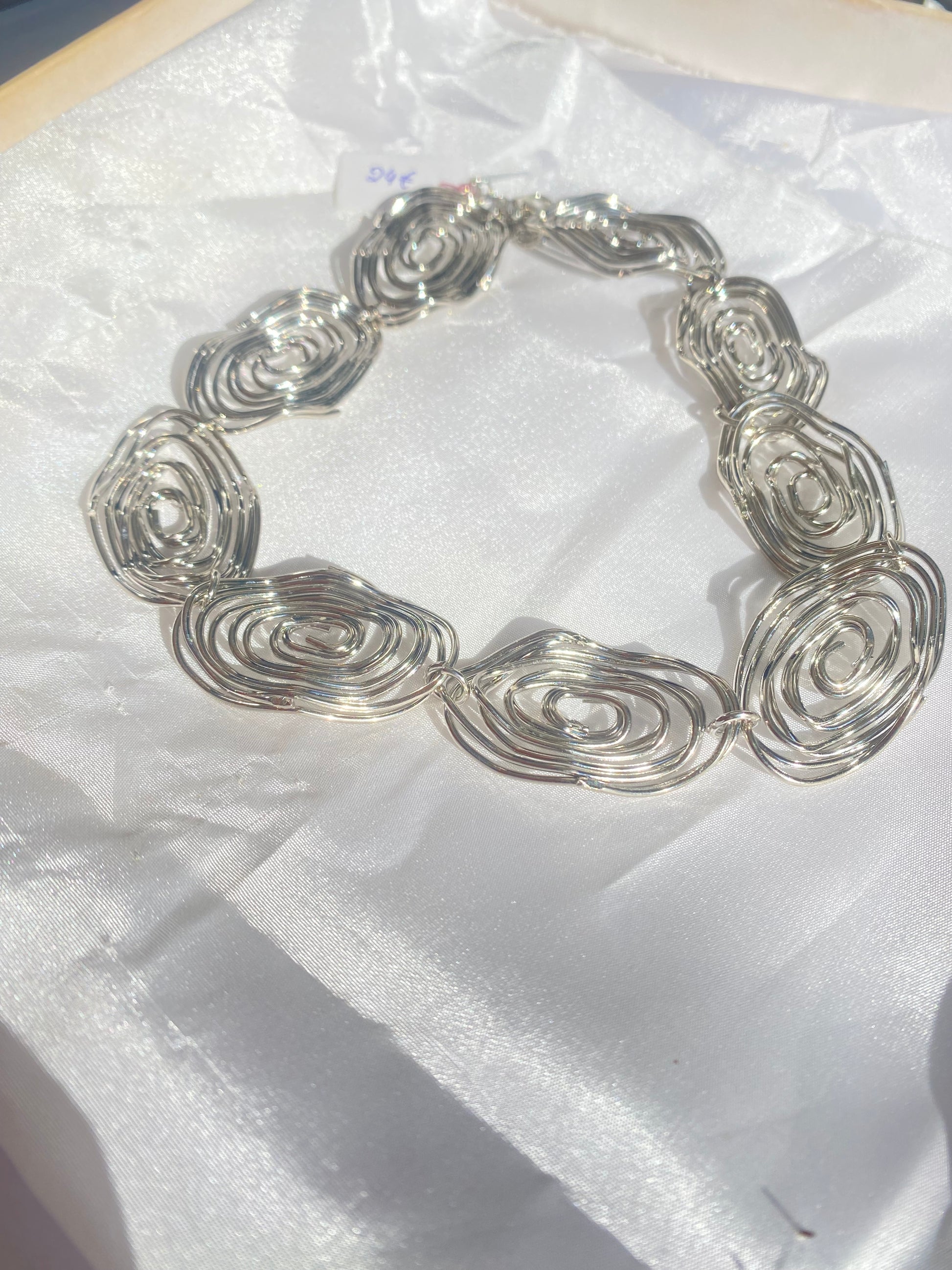 Κολιέ φουλ καλοκαιρινό - ανοιξιάτικο αρχαιοελληνικού στυλ σε ασημί χρώμα. Έχει τη δυνατότητα να φορεθεί και εφαπτόμενο στο λαιμό (υλικό κατασκευής: ορείχαλκος).