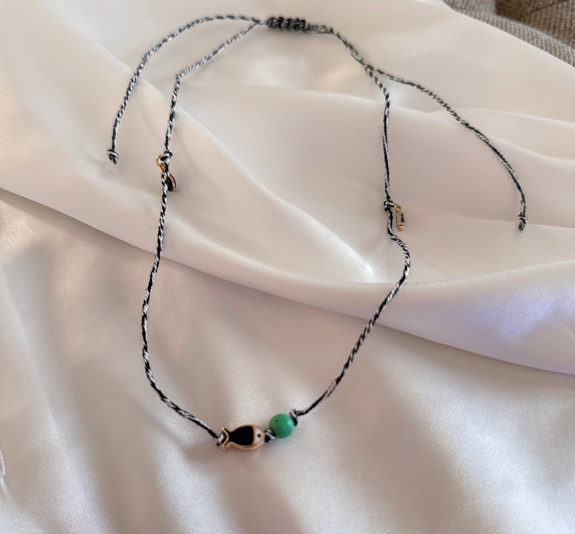 Κολιέ με πλέξη μακραμέ με κρεμαστά στοιχεία από ανοξείδωτο ατσάλι.