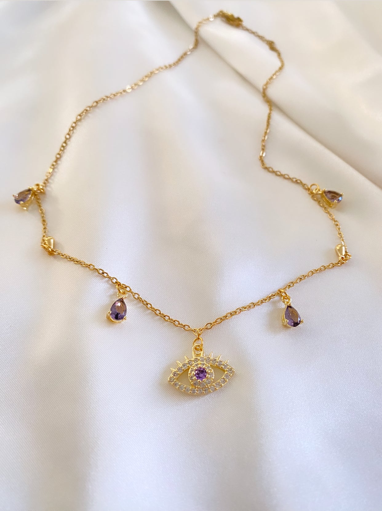 Εντυπωσιακό χρυσό κολιέ με μωβ κρυσταλλάκια Βενετίας και ματάκι.