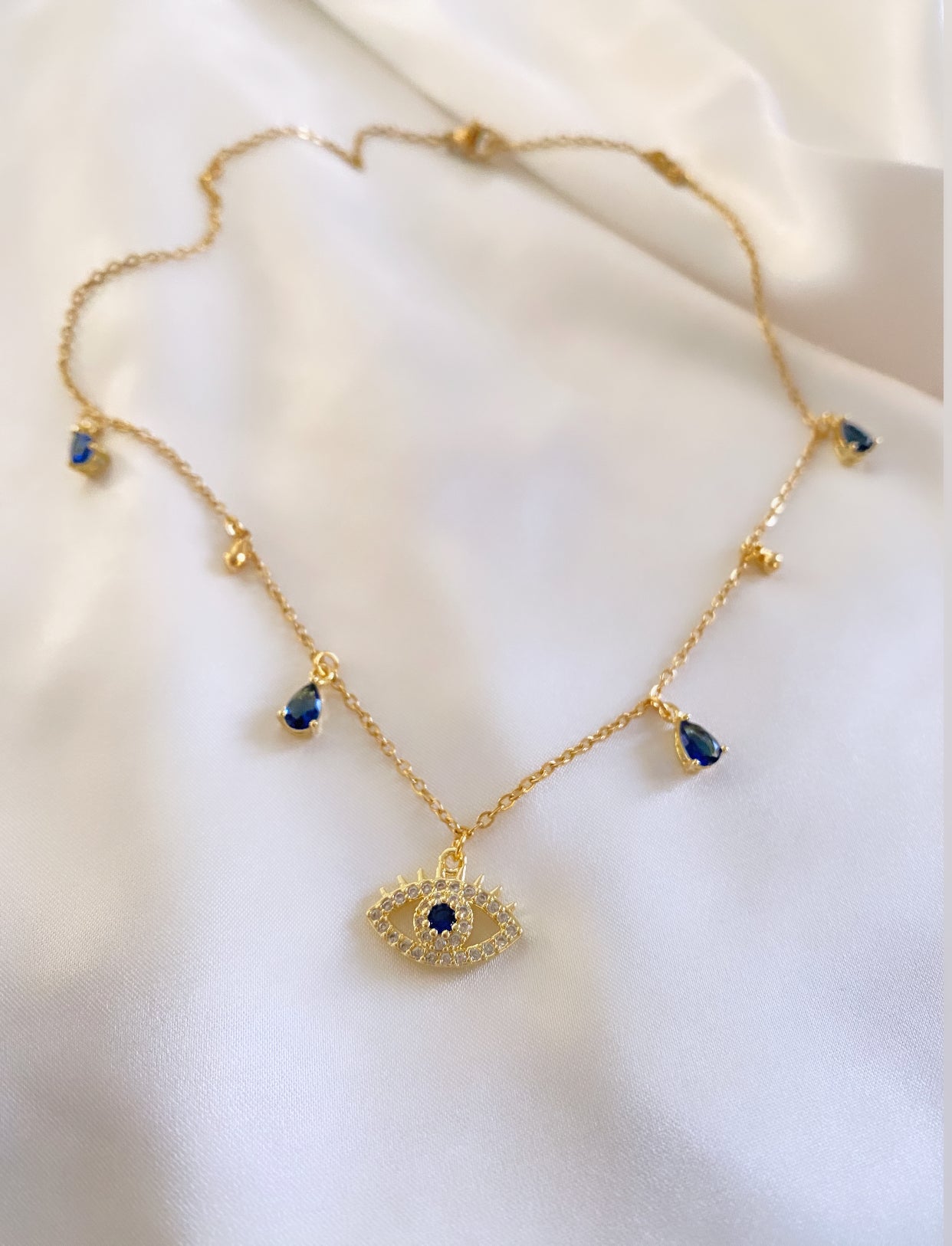 Εντυπωσιακό χρυσό κολιέ με μπλε κρυσταλλάκια Βενετίας και ματάκι.